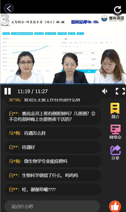 招聘会直播现场,参加“直播带岗”的用人单位HR化身主播轮番上阵,“屏对屏”直播发布招聘岗位,从单位概况、岗位信息、福利待遇等方面进行全方位讲解,通过播放企业宣传片,令求职者更深入的了解企业环境、文化以及其招聘诚意。主持人与用人单位HR现场积极回答求职者通过弹幕发送的各种问题,打消求职者的困惑和顾虑,求职者通过直播间链接点击自己感兴趣的企业及岗位在线投递简历。