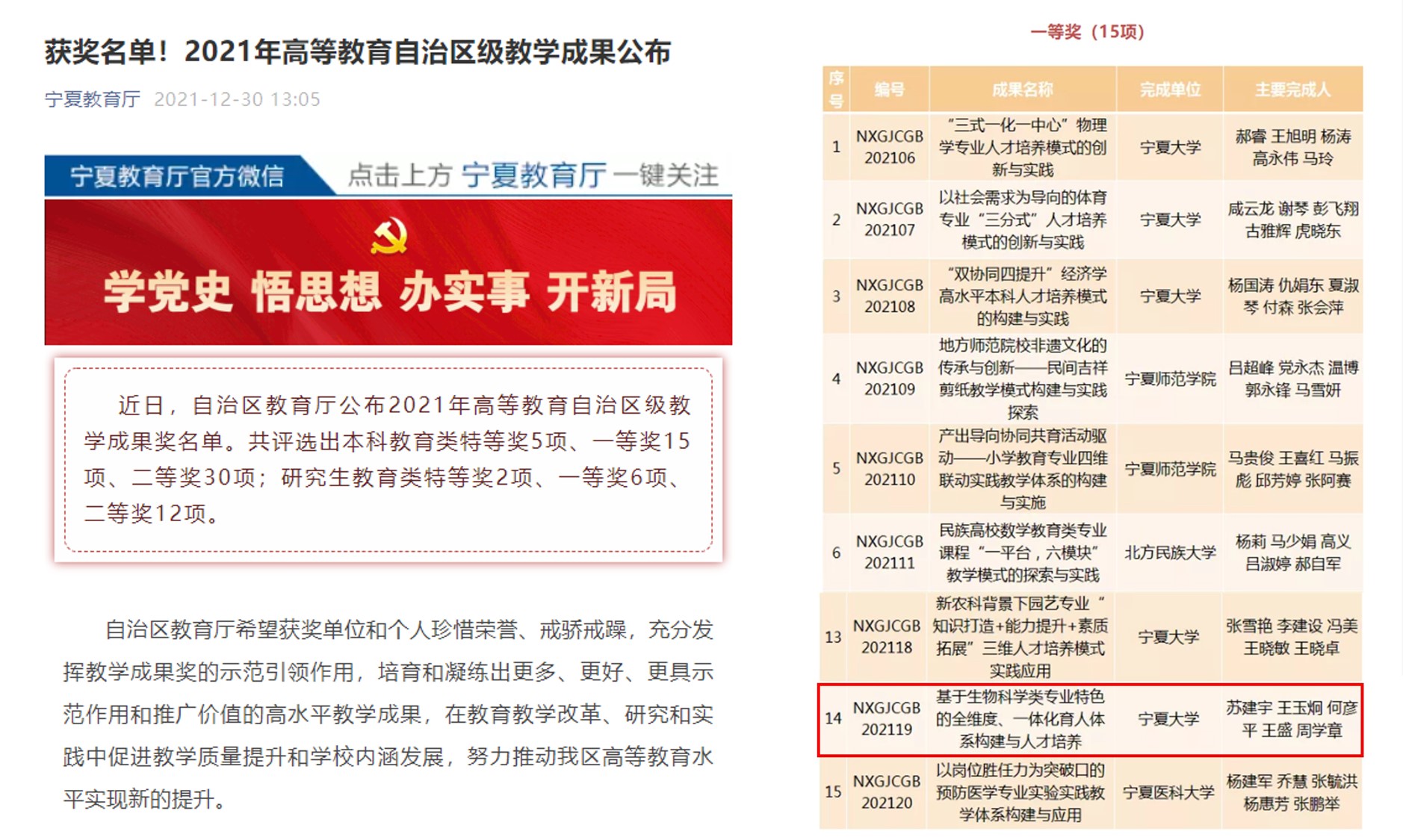 近日,自治区教育厅公布2021年高等教育自治区级教学成果奖名单,公司由苏建宇、王玉炯、何彦平、王盛、周学章等五人完成的“基于生物科学类专业特色的全维度、一体化育人体系构建与人才培养”项目荣获一等奖。