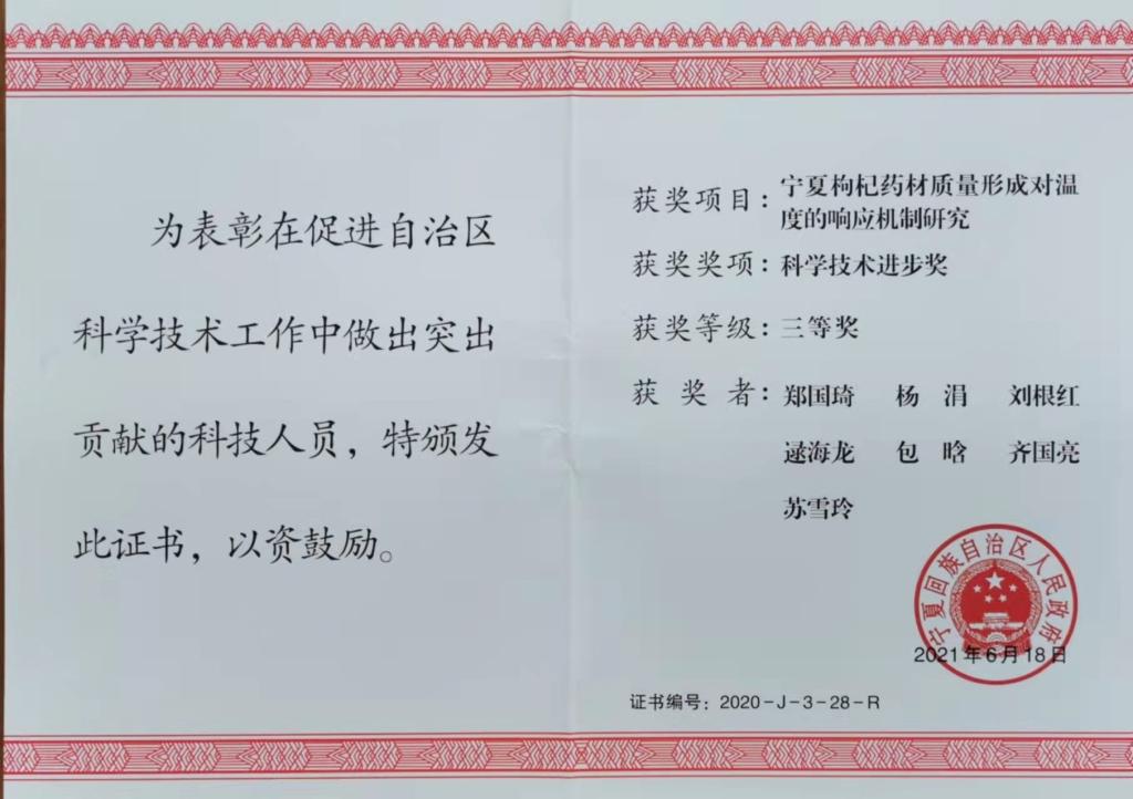《宁夏枸杞药材质量形成对温度的响应机制研究》项目由郑国琦教授主持,主要对道地产区宁夏枸杞夏果生产中后期环境温度的升高和非道地产区温度变化导致的枸杞商品品质和药用品质与现行枸杞质量评价标准不匹配的问题进行研究,研究成果对揭示宁夏枸杞道地性成因形成的环境机制及枸杞子药材质量质量标准的完善提供了理论依据。该项目发表论文8篇,其中在该领域顶级刊物收录1篇,中文核心期刊5篇;参编专著1部;培养硕士研究生2名,青年教师2名。