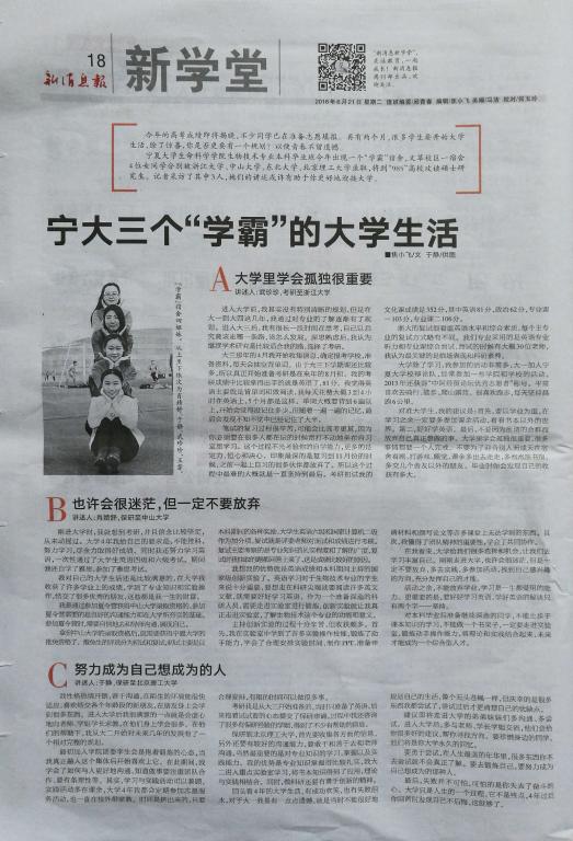宁夏老员工命科学公司生物技术专业本科毕业班今年出现一个“学霸”宿舍,文萃校区一宿舍4位女同学分别被浙江大学、中山大学、东北大学、北京理工大学录取,将到“985”高校攻读硕士研究生。记者采访了其中3人,她们的讲述或许有助于你更好地迎接大学。