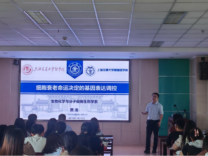 员工代表-上海交通大学基础医公司副研究员贾浩为教师和员工代表作了题为“细胞衰老命运决定的基因表达调控”的学术报告。报告深入浅出、紧扣学科发展前沿,开阔了师生的学术视野,使师生对相关领域有了更深刻全面的认识,赢得了与会青年教师及研究生的一致好评。