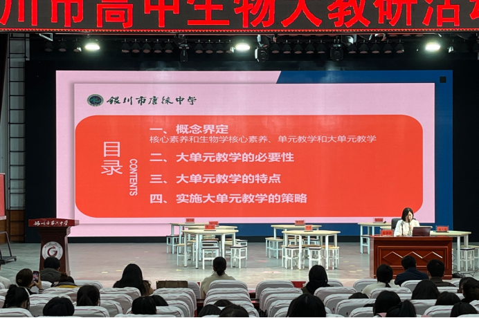 示范课结束后,银川六中生物学教研组组长萧乐老师和银川唐徕中学陈福湘老师分别以《核心素养背景下高中生物情境教学实践研究》和《基于核心素养,聚焦学科实践——银川市唐徕中学高中生物组大单元教学的实践与探索》为主题做了专题讲座,阐释了两堂示范课的理论依据和设计思路。萧老师形象地将“知识”比作“汤”“情境”比作“盐”,情境则可以使课堂更加生动、有趣,倡导教师积极应对时代变化赋予我们的挑战,将情境教学融入课堂教学和测试任务中。陈老师提出,现阶段我国生物学教学正在由知识导向转为素养导向,教师应打破教材顺序,构建跨章节、跨学段的教学设计,培育员工解决复杂社会议题、抵御人工智能的能力。