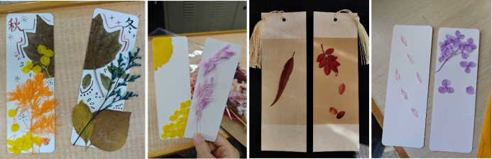 压制、固定、封装。。。在轻柔的动作与欢声笑语中,时光仿佛被缓缓压缩。那些曾摇曳在枝头、散落在路边的秋日信使,在同学们的巧手下,被凝练成了一张张精美的书签。