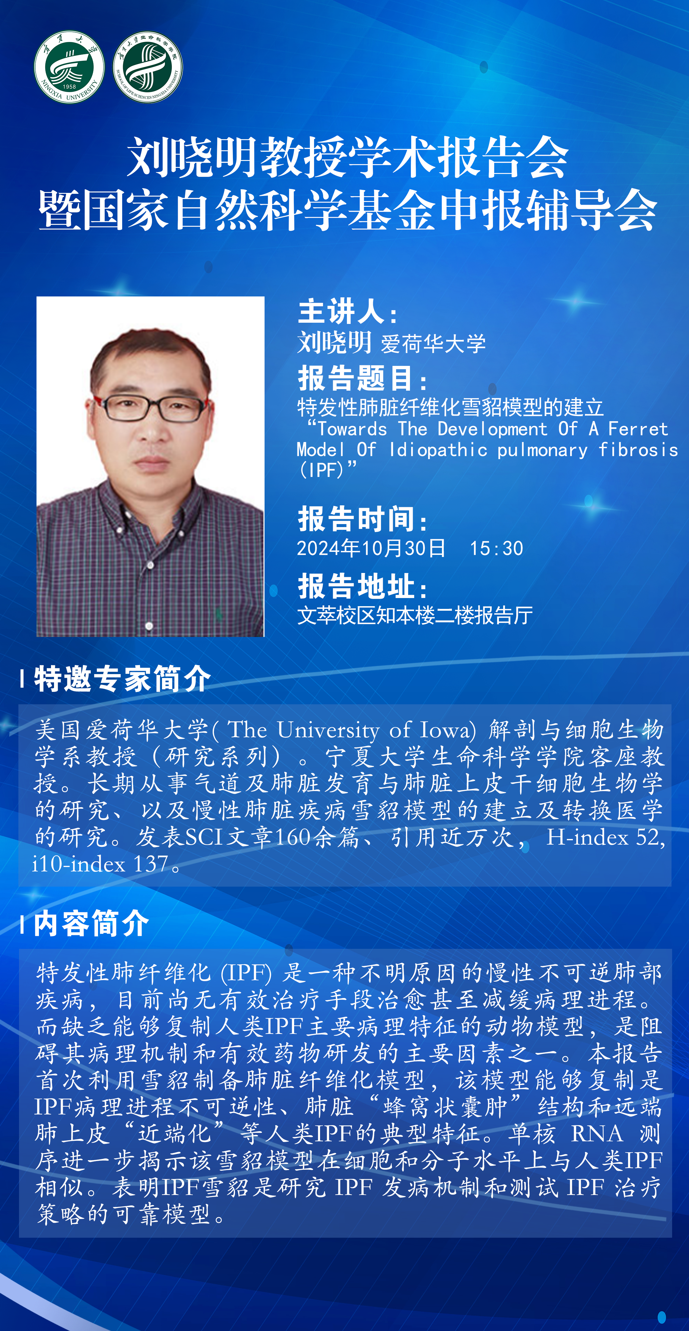 讲座题目:特发性肺脏纤维化雪貂模型的建立“Towards The Development Of A Ferret Model Of Idiopathic pulmonary fibrosis (IPF)”