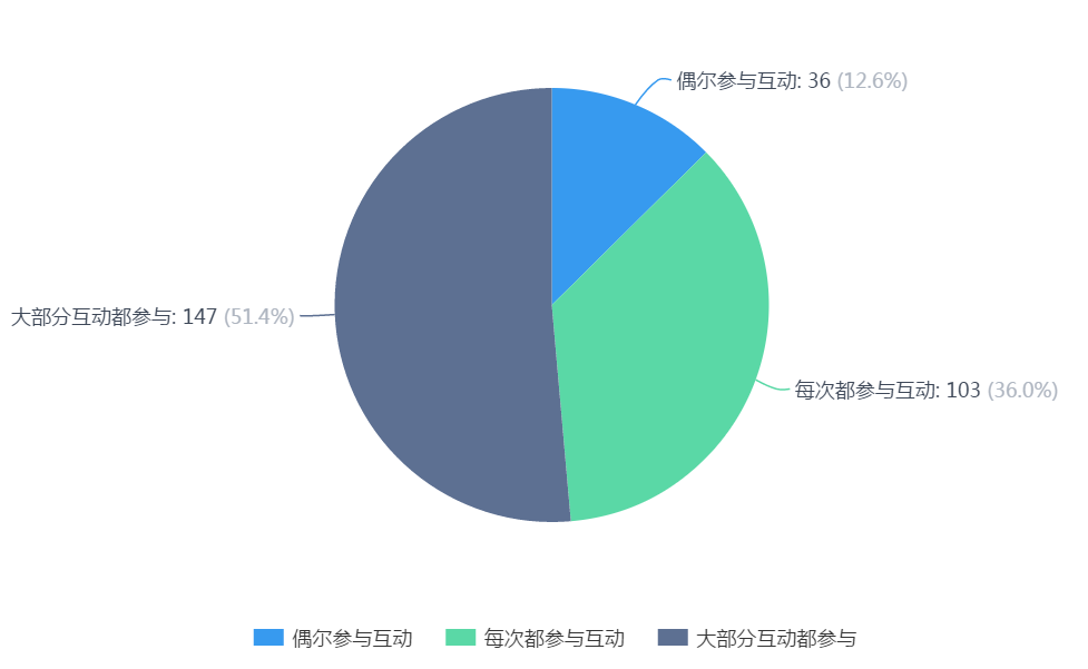 6.员工参与在线学习互动频率:每次都参与的互动员工占 36.0%,大部分互动都参与的员工占51.4%,偶尔参与互动的员工占12.6%。