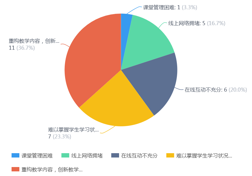 9.对于线上教学您面临的最大压力是:重构教学内容,创新教学设计占36.7%,难以掌握员工学习状况占23.3%,在线互动不充分占20.0%,线上网络拥堵占16.7%,课堂管理困难,也是对老师造成较大挑战的因素之一。