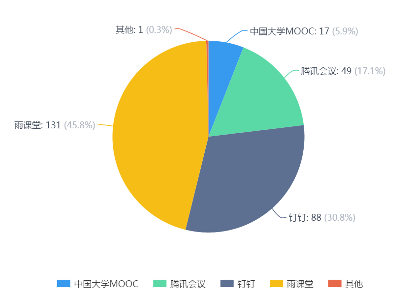 本学期前三周,全院计划开展在线教学课程220门次,其中,使用雨课堂开展线上教学128门次,使用腾讯会议14门次,使用钉钉74门次,使用中国大学 MOOC 等其他平台4门次,计划课程全部实现在线教学,整体教学平稳有序。