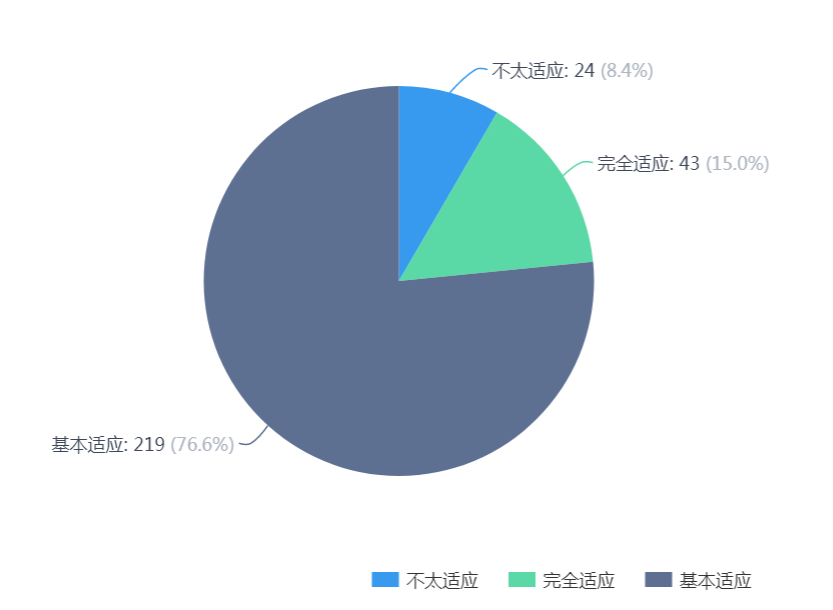 1. 经过三周的在线学习,员工的适应程度:员工完全适应15.0%,基本适应 76.6%,不太适应 8.4%。