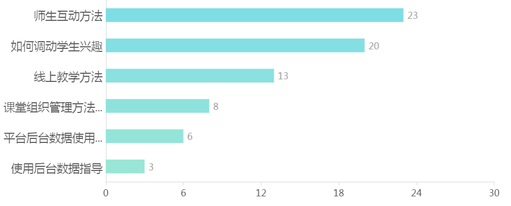 6.老师最希望获得的在线课程指导的方面有:师生互动方法,如何调动员工兴趣及线上教学方法等。
