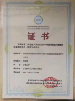 团队成员指导员工积极参与保护生物多样性的相关研究,并多次获得奖励,郑国琦指导员工作品“宁夏南华山国家级自然保护区中段阴坡和阳坡植被多样性研究”获第二届全国老员工生命科学创新大赛优秀成果奖指导教师三等奖(创新类2019)。