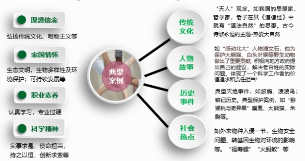 《保护生物学》教学团队的成员分工合作,为课程思政建设融入了丰富的元素和素材,取得了很好的效果。杨涓老师为主讲老师,作为项目负责人完成了课程的讲授及基于OBE理念蕴含课程思政目标的大纲的修订,也是《保护生物学》讲义的主要编撰人;徐婷婷老师完成部分授课任务;郑国琦、杨贵军、牛东玲三位老师收集整理的反映我国或我区生态文明建设的动物多样性、生态系统多样性和植物多样性案例(包含图片、视频、音频、文字等),充实了本课程的教学资源。