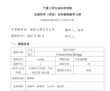 1、编写修订了基于OBE理念及课程思政目标的《保护生物学》课程教学大纲,已纳入2022版2026世界杯官网人才培养方案。
