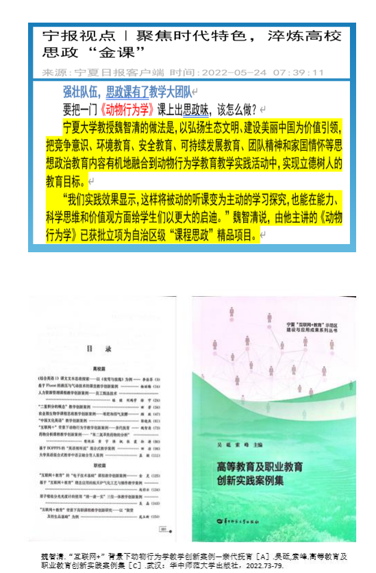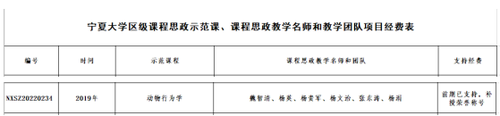 《动物行为学》教学团队获“2023 年全区大中小公司思想政治工作质量提升工程项目: 区级课程思政教学名师和团队”荣誉称号(宁教工委〔2023〕2 号,2023 年 2 月 15 日)。