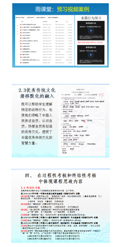 《动物行为学》研究动物在自然条件下的各种行为(本能、学习、生存、繁殖、社群等)。 掌握动物行为学所揭示的规律,不仅能为防治有害动物提供措施和方法,而且会对有益动物 和稀有动物的保护、繁育和合理取用提供科学依据。在教学中,潜移默化的融入思想政治教 育内容,以弘扬生态文明、建设美丽中国为价值引领,把竞争意识、环境教育、安全教育、 挫折教育、审美教育、情感教育、爱的教育、人口教育、可持续发展教育、创造发明教育、 动物福利教育和生命伦理教育、探索精神、雷锋精神、团队精神、家国情怀和文化传承等思 想政治教育内容有机地融合到动物行为学公司产品实践活动之中,在动物行为学知识传授和 能力培养过程中,达成立德树人的教育目标。