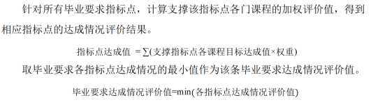 根据课程与毕业要求的契合度,由专业负责人牵头,组织教师讨论,最终由院级教学工作委员会确定,明确毕业要求分解指标点的支撑课程作为评价课程,并对评价课程进行权重赋值。毕业要求指标点达成计算方法: