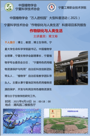 2021610日下午,中国植物学会理事、宁夏老员工命科学公司副书记、博士生导师梁文裕博士受邀为宁夏工商职业技术公司的300余名员工开展了《作物驯化与人类生活》科普讲座,报告会由宁夏工商职业技术公司科研处处长张海鸣主持。